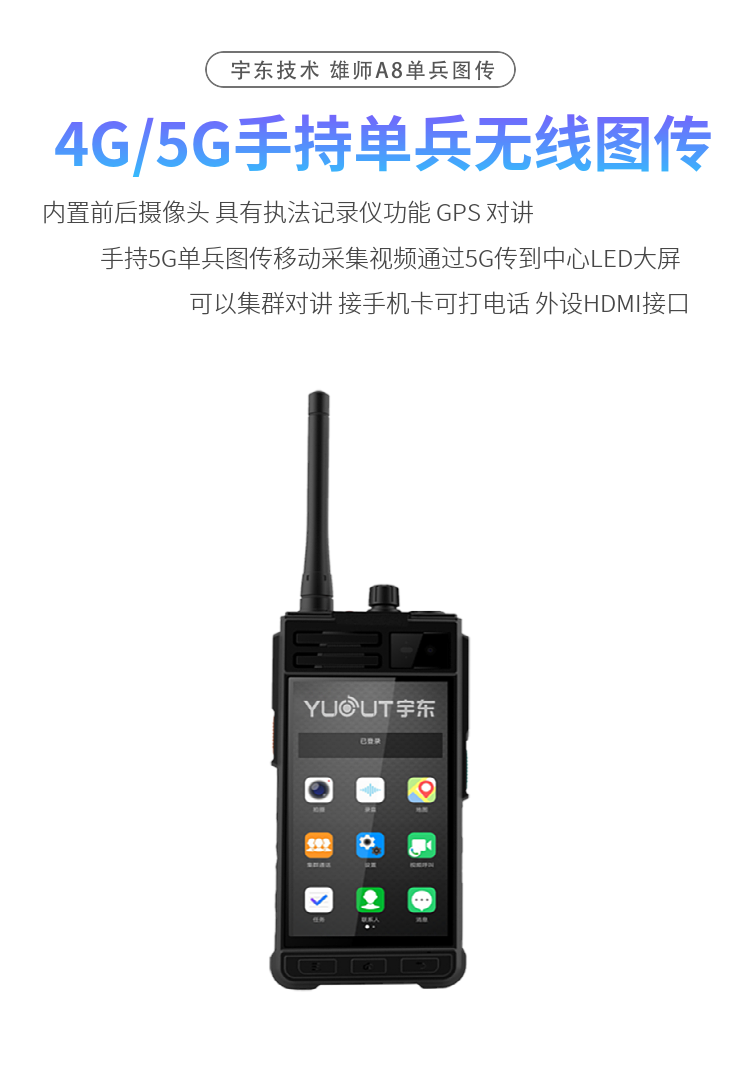 雄師A8 YD-TSP210-D-4/5G型執行記錄儀終端是一款高性能的單人便攜型視頻產品,可提高前端人員執法透明度、加強執法人員與指揮中心實時溝通能力。該產品具有高清無線視頻圖傳、北斗/GPS定位、應急調度、集群呼叫、移動辦公、業務查詢等功能,可廣泛應用于公安、交/巡警、法院、消防、武警、人防應急、邊防、城管、保險理賠、工地施工、電力搶修、鐵路搶修、公司視頻會議、電力維修、消防救援、公路管理等場合。