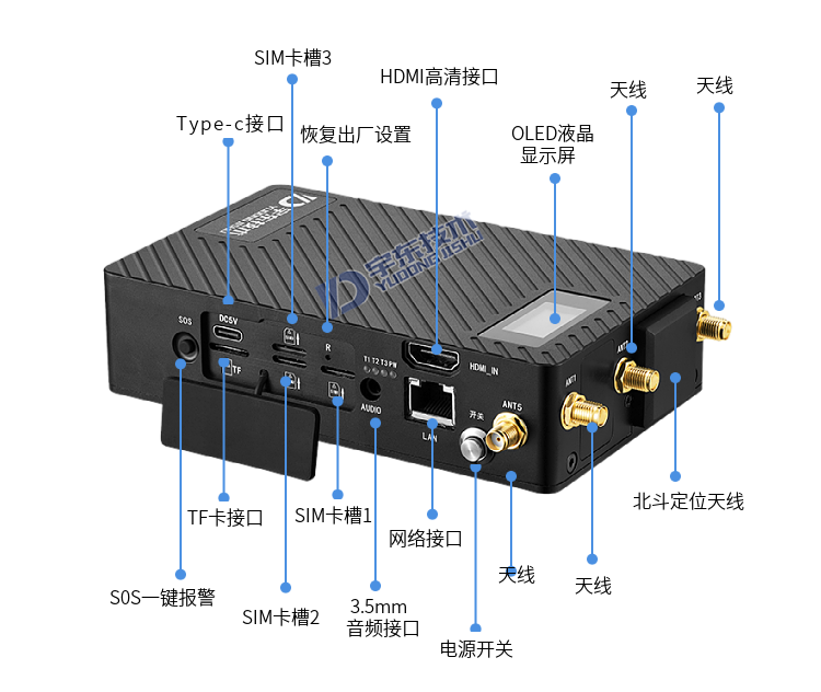 YD-GB5030-5G單兵圖傳,具備三個SIM卡槽,同時支持一個5G網絡和兩個4G網絡, 5G便攜式多卡高清視頻終端采用嵌入式系統架構,采用高性能H.265編解碼處理器設計。設備支持視頻采集、編碼壓縮、傳輸、雙向對講功能。